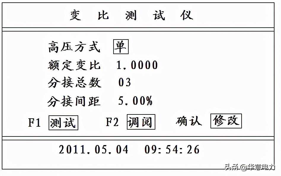 打开电源开关显示出主菜单(见图3),此时按确认键,显示见图5。此时可输入额定变比值,按照变压器铭牌上的高压端9分接电压值110.0,低压电压10.5,计算出额定变比10.476,输入额定变比10.476,分接总数09,分接间距1.25%,输入完成后,按返回键返回到主菜单,按F1键,仪器开始测量,测量结果见图10所示。