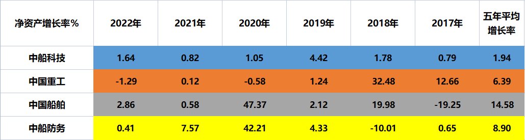 净资产增长率排名第一,中国船舶,年均增长14.58%。