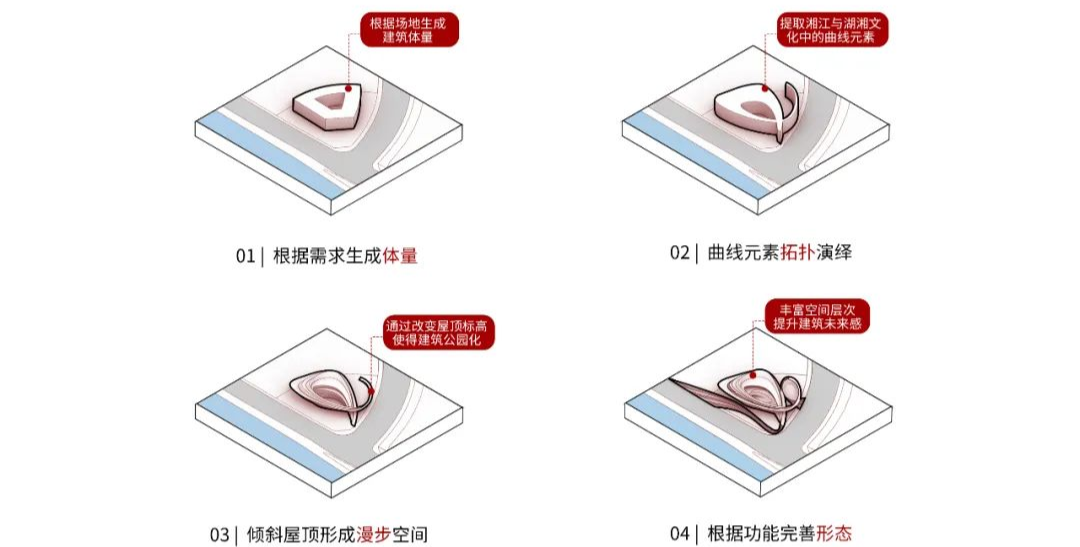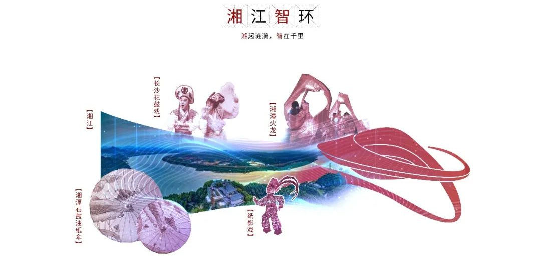 纵览湖湘历史长河,人才辈出,文化底蕴深厚。诸如风景秀丽的湘江、传统戏剧花鼓戏、传统技艺石鼓油纸伞与纸影戏影偶、传统舞蹈湘潭火龙等,无不体现着湖湘文化精致柔美的一面。设计从湖湘文化入手:引湘江之水,取其形;览湖湘文化,得之魂;与科技相结合,从而形成传统文化与科技未来感相得映彰的建筑形体。