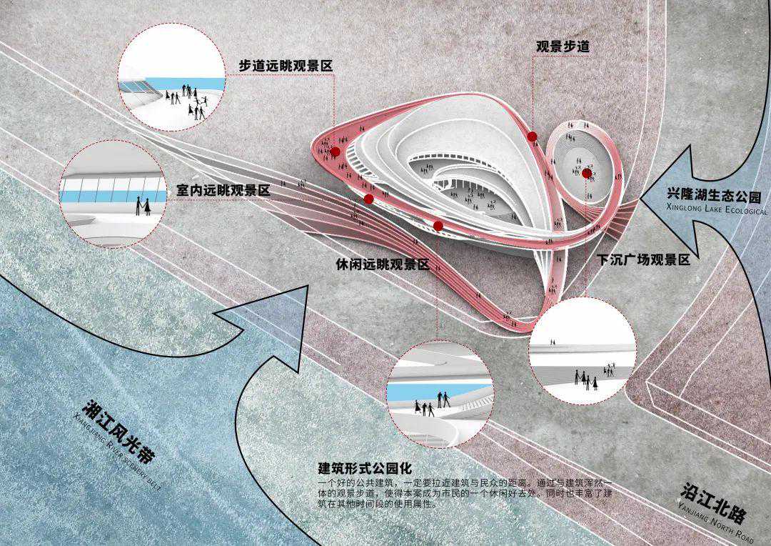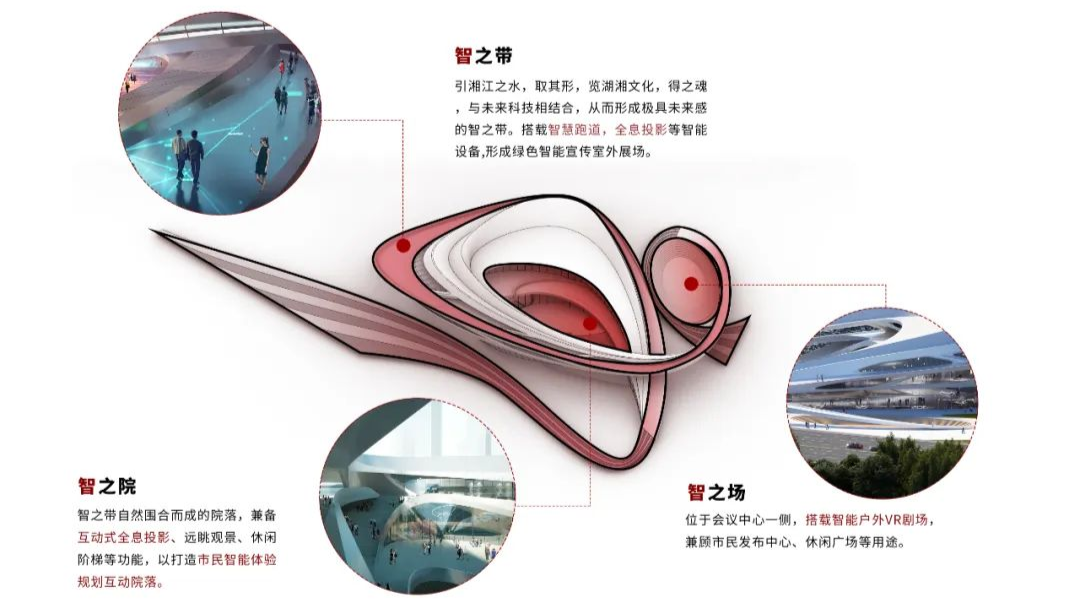 建筑功能科技未来化:通过充满未来感的建筑形体,并搭载多种智慧科技设施,彰显“湘江科学城”辐射片区的科技感与未来感。建筑通过引自湘江的一股“水流”,搭载智慧跑道、全息投影等智能设备,形成绿色智能宣传室外展场;“智之带”自然盘旋围合而成“智之院”,兼备互动式全息投影、远眺观景、休闲阶梯等功能,以打造市民智能体验规划互动院落。“智之场”位于“智之带”末端,搭载智能户外VR剧场,兼顾市民发布中心、休闲广场等用途。