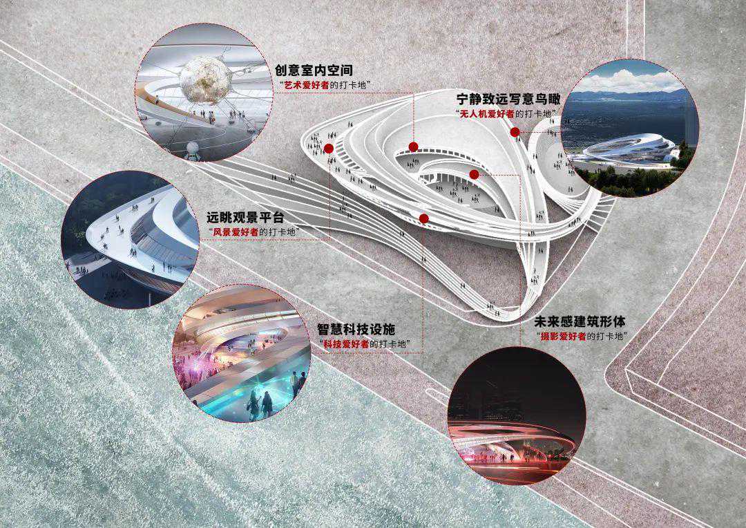 建筑空间网红化:针对各类人群的喜好,塑造极具吸引力的打卡地,如远眺观景大平台、创意室内空间、智慧科技设施、未来感建筑形体、丰富第五立面等特色,吸引风景、艺术、科技、摄影、无人机爱好者等前来打卡,使得建筑更具话题性、地标性。