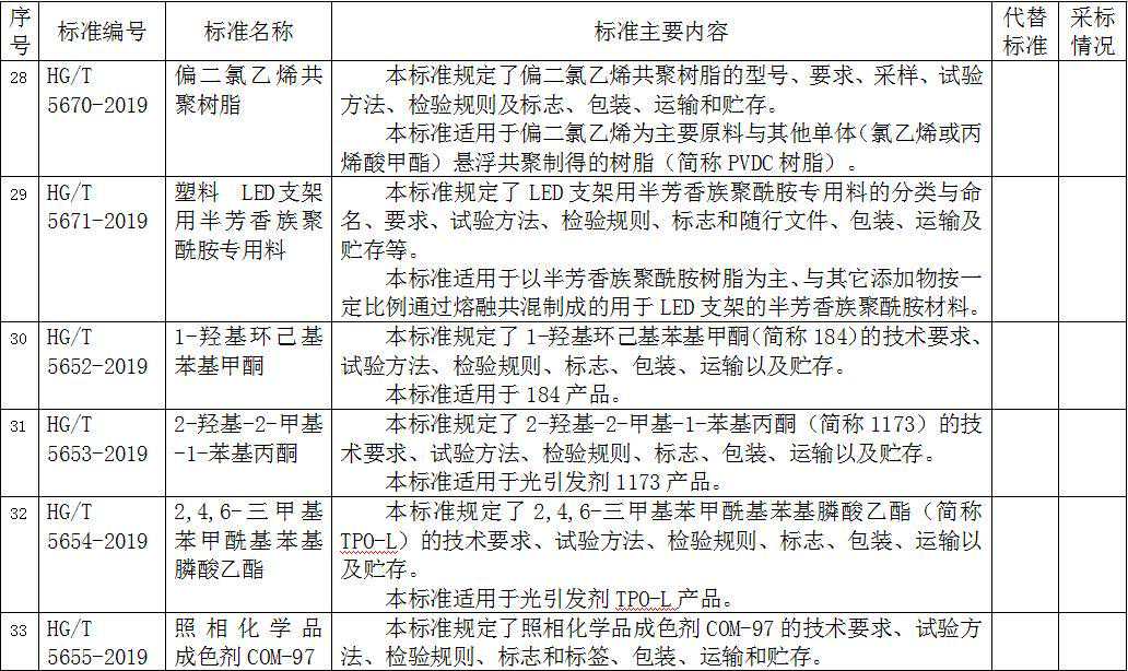 根据行业标准制修订计划,相关标准化技术组织已完成《阻燃化学品聚磷酸三聚氰胺》等150项化工行业标准、《工业用碳九芳烃》等5项石化行业标准、《真空自耗炉结晶器》等5项冶金行业标准、《高性能红外探测器用热释电单晶》等22项建材行业标准、《智能热水循环屏蔽电泵》等39项机械行业标准、《多旋翼无人机系统通用要求》等2项航空行业标准的制修订工作。在以上标准批准发布之前,为进一步听取社会各界意见,现予以公示,截止日期2019年11月12日。