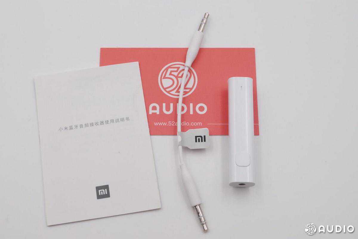 包装盒内所有物品,有一根3.5mmAUX线、小米蓝牙音频接收器本体和一份说明书。