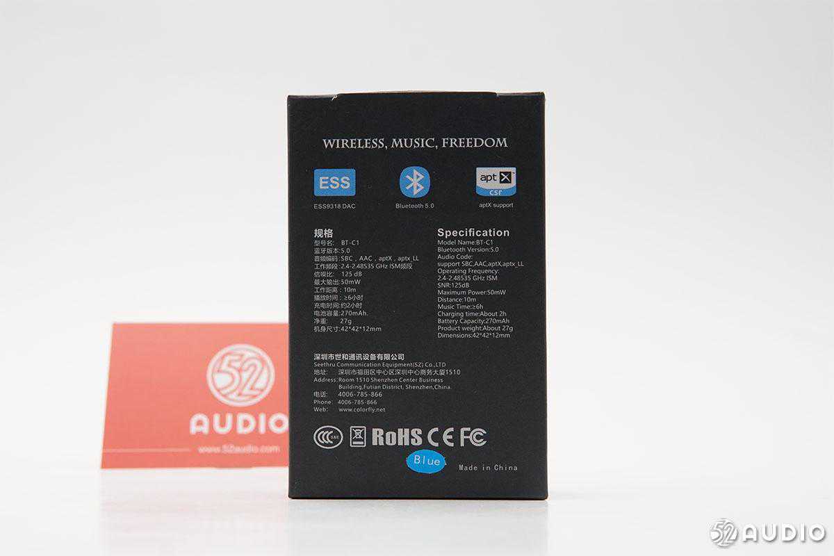 从包装背面看到,七彩虹ColorflyBT-C1采用了ESSES9318DAC,这款是vivoX9splus的同款DAC,ESSES9318采用集成运放的设计,可以有效节省PCB空间和降低功耗和发热。采用了高通CSR8670,支持蓝牙5.0。在音频传输技术上,支持aptX,aptX_LL(aptXLowLatency),aptX可以让蓝牙无线音频达到CD级别的听感,aptXLowLatency是低延迟的蓝牙连接协议,适合玩游戏和其它实时操作。