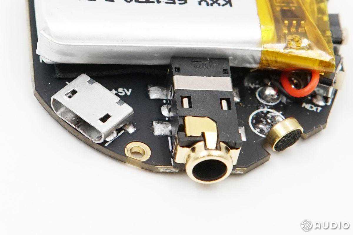 主要扩展元件被焊接在这一边,从左往右分别是:MicroUSB插座、3.5mm镀金插座和电容式麦克风。