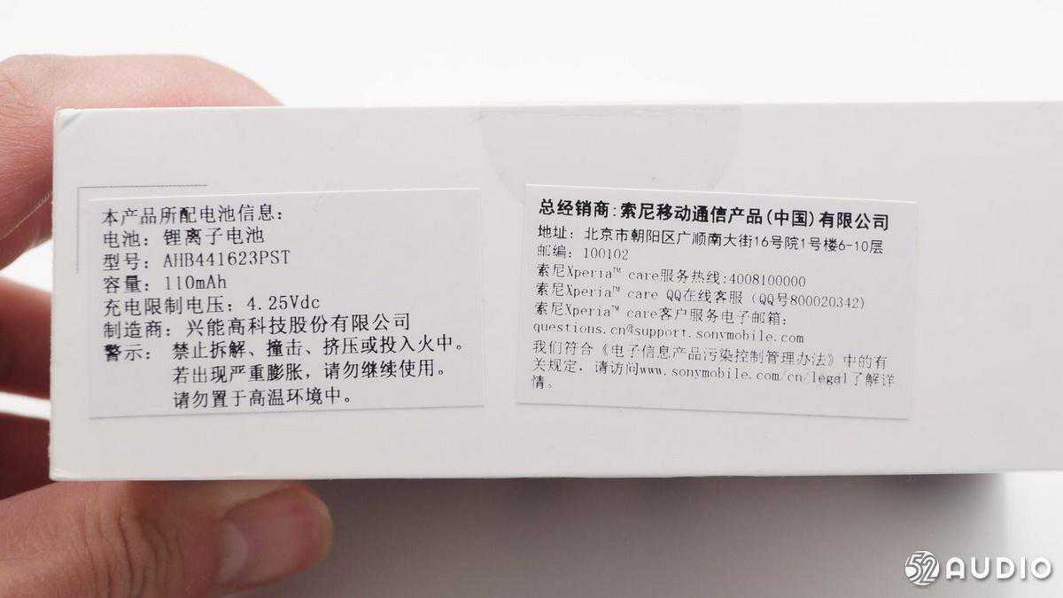 包装底部有中国经销商的贴纸和产品电池信息,锂离子电池,型号:AHB441623PST,容量:110mAh,充电限制电压:4.25VDC,制造商:兴能高科技股份有限公司。