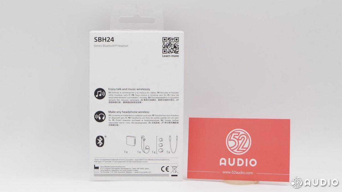 包装背后展示的是产品特色,其中包含:畅享无线通话、畅享无线聆听音乐、对任意耳机提供无线功能。包装内含有:蓝牙接收器x1、MH755耳机x1、耳塞套x3、USBType-C数据线x1。索尼移动出品。