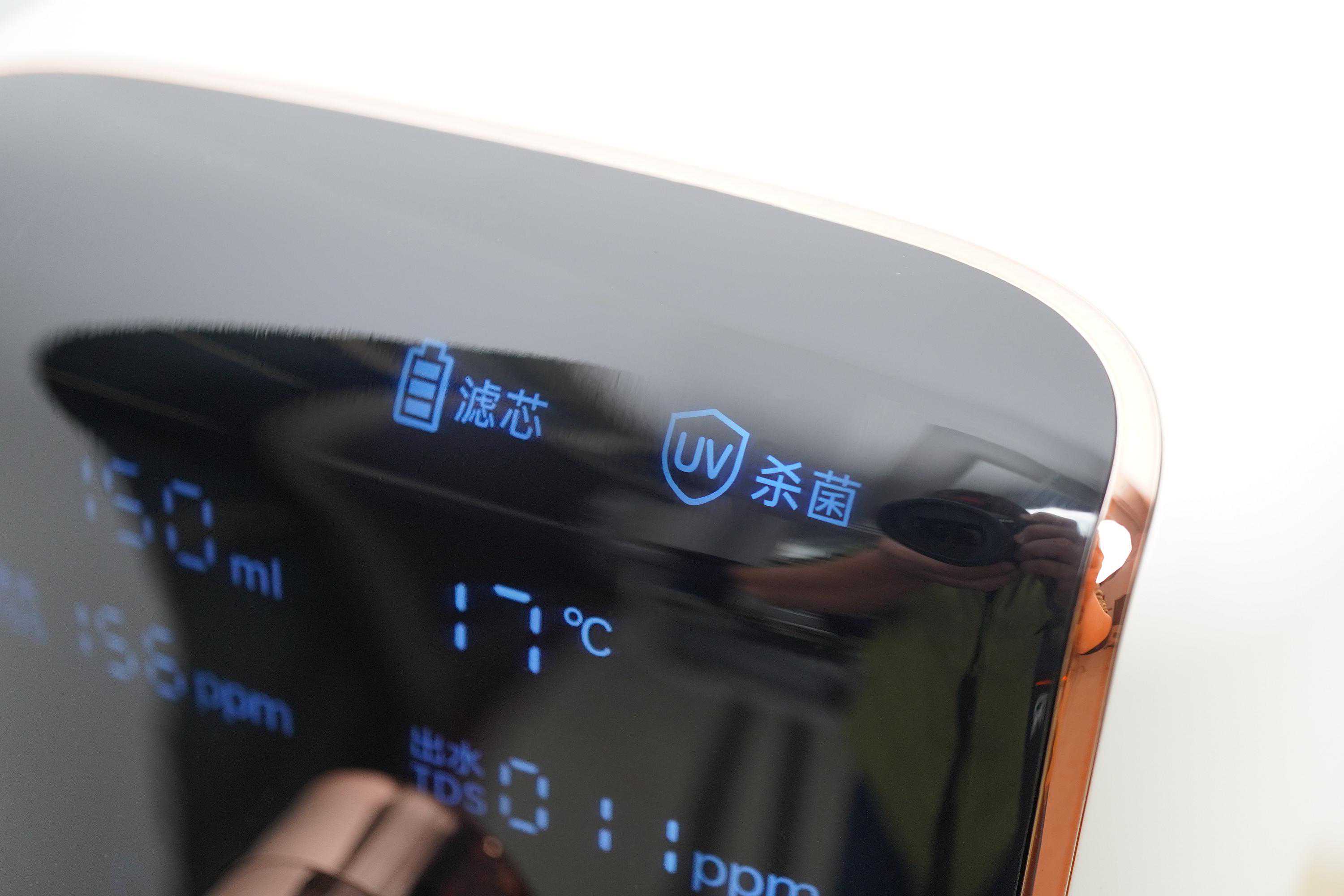 5.3水量、温度多档位,童锁、泡奶更安全▲宜盾普净饮机的控制面板亮度还是蛮不错的,在光照强时的辨识度仍然很好。界面从上到下,从左往右的功能分别为制水、缺水、滤芯寿命、杀菌、当前出水量档位、当前温度档位、原水TDS、出水TDS,以上为显示图标。再往下区域功能为控制按键,包括水量、泡奶、出水键、复位和童锁。泡奶键专为母婴设置,一键45℃+150mL出水量,特别适合还需要泡奶粉喝的小孩用。
