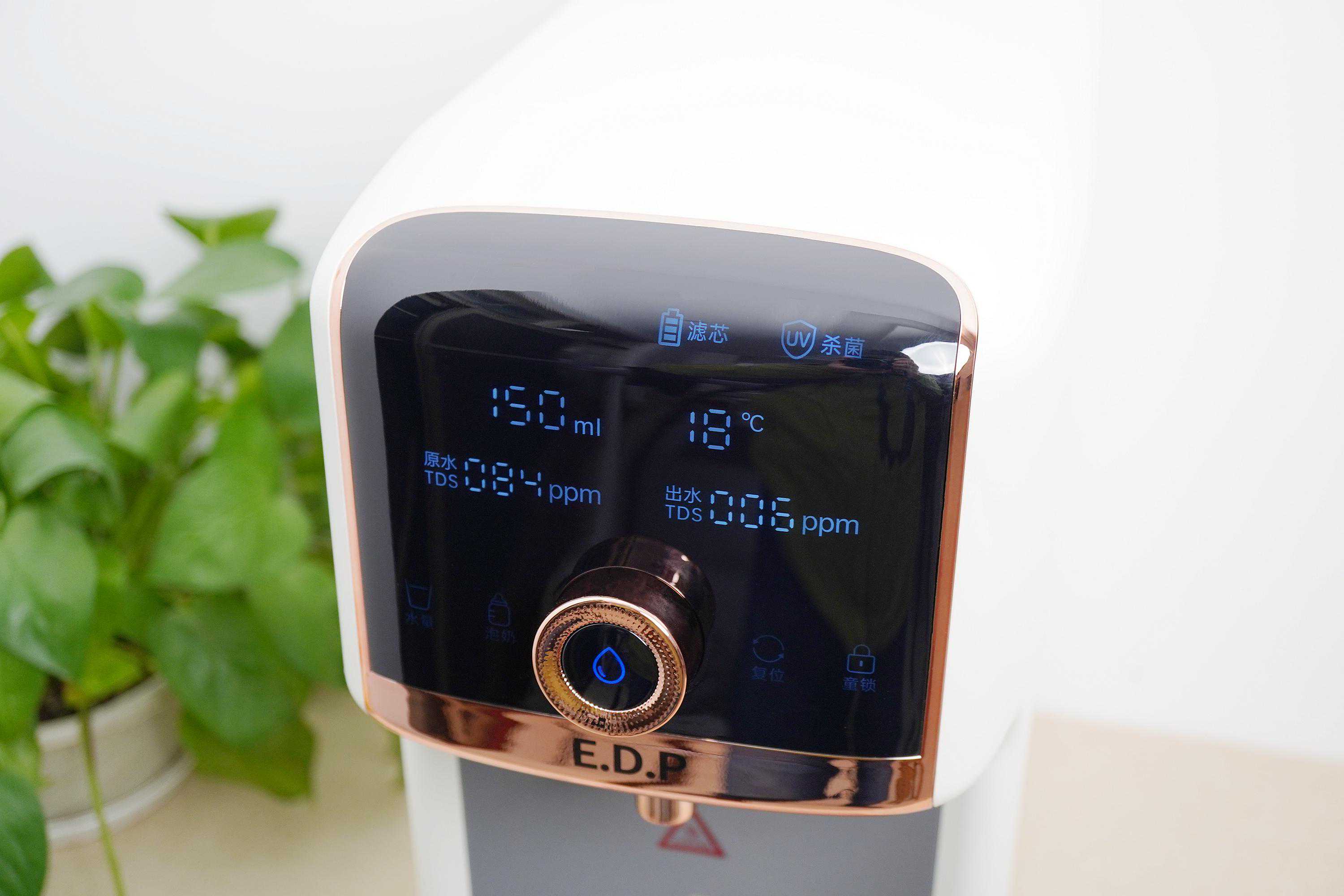 ▲宜盾普净饮机控制面板上还能实时显示当前原水、出水TDS值,便于用户了解当前产水效果,以供更换滤芯参考(当原水和出水TDS值数值接近或者出水TDS值偏高,则有必要更换滤芯)。