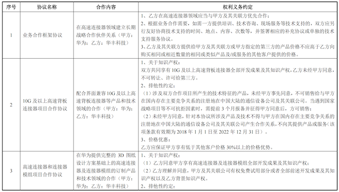 根据一轮问询函回复,华丰科技与华为签署了合作协议,主要条款包括:双方共同享有或华为单独享有项目全部开发成果及其知识产权,相关产品不可销售给与华为在国内存在主要竞争关系的注册地在中国大陆的通信设备公司及其关联公司,保证华为享有低于其他客户价格30%以上的价格优势。