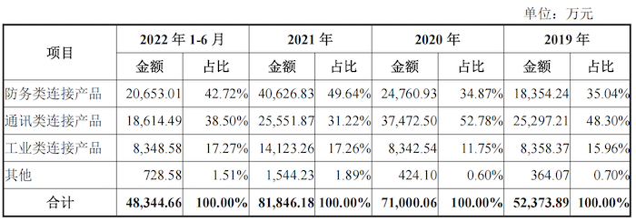 据悉,九洲线缆主要从事光电线缆及光电线缆组件的研发、生产和销售。招股书显示,2019年至2022年1-6月,九洲线缆的线缆组件销售收入分别为1260.92万元、2797.51万元、1839.37万元和1651.66万元。