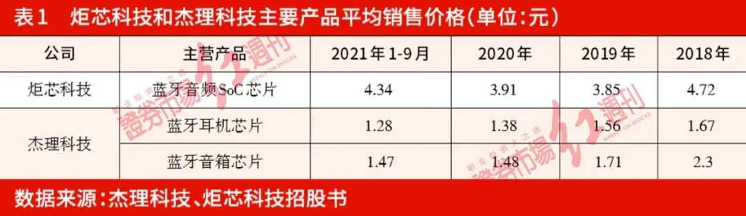 招股书披露,报告期内(2018年至2021年1~9月),杰理科技的主营业务收入主要来自蓝牙耳机和蓝牙音箱芯片的销售,其中蓝牙耳机芯片收入占比分别为34.17%、41.20%、44.68%、39.80%,蓝牙音箱芯片收入占比分别为52.77%、45.76%、40.08%、33.32%,两种产品为主营业务贡献了超过七成的收入。