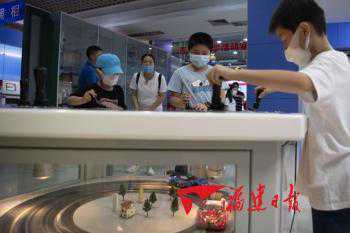 台海网6月4APP-新福建报道3日,在孩子们的期盼中,福建省科技馆恢复开放。当天上午,有观众陆续到馆,在工作人员的引导下,展厅入口处观众经过体温检测、出示健康码、扫码验证、手部消毒等流程后有序进馆参观。图为,孩子们在科技展品前体验。(记者王毅摄)