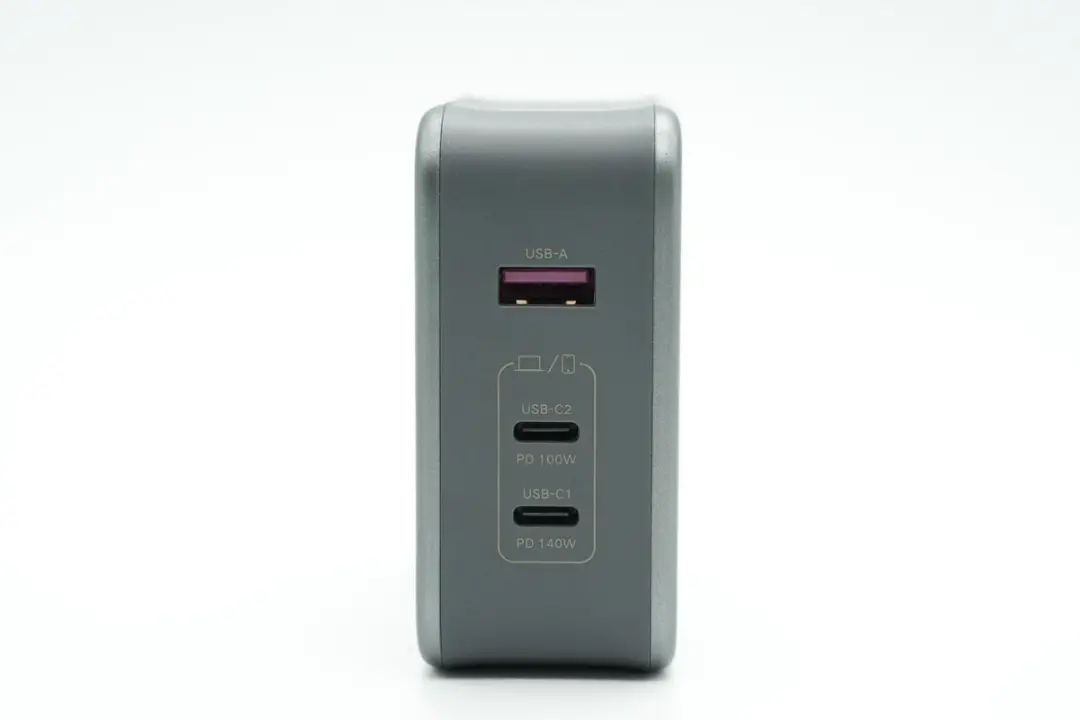 倍思140W2C1A氮化镓充电器具备2C1A输出接口,三口都采用了橘色母座设计,比较艳丽。机身是磨砂设计,正面有大写的140W字体及氮化镓标志。整体风格偏成熟内敛,适合商务出行的感觉。