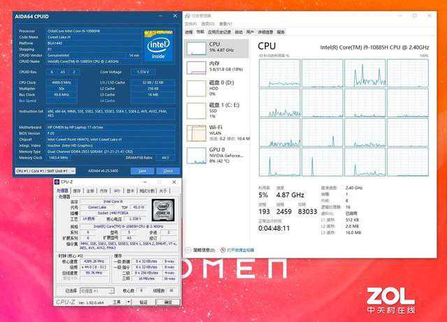 i9-10885H是一颗八核心十六线程处理器,其核心规格与顶级移动处理器i9-10980HK完全一致,以至于AIDA64都将其识别为i9-10980HK。最高睿频可达5.3GHz,堪称游戏利器。