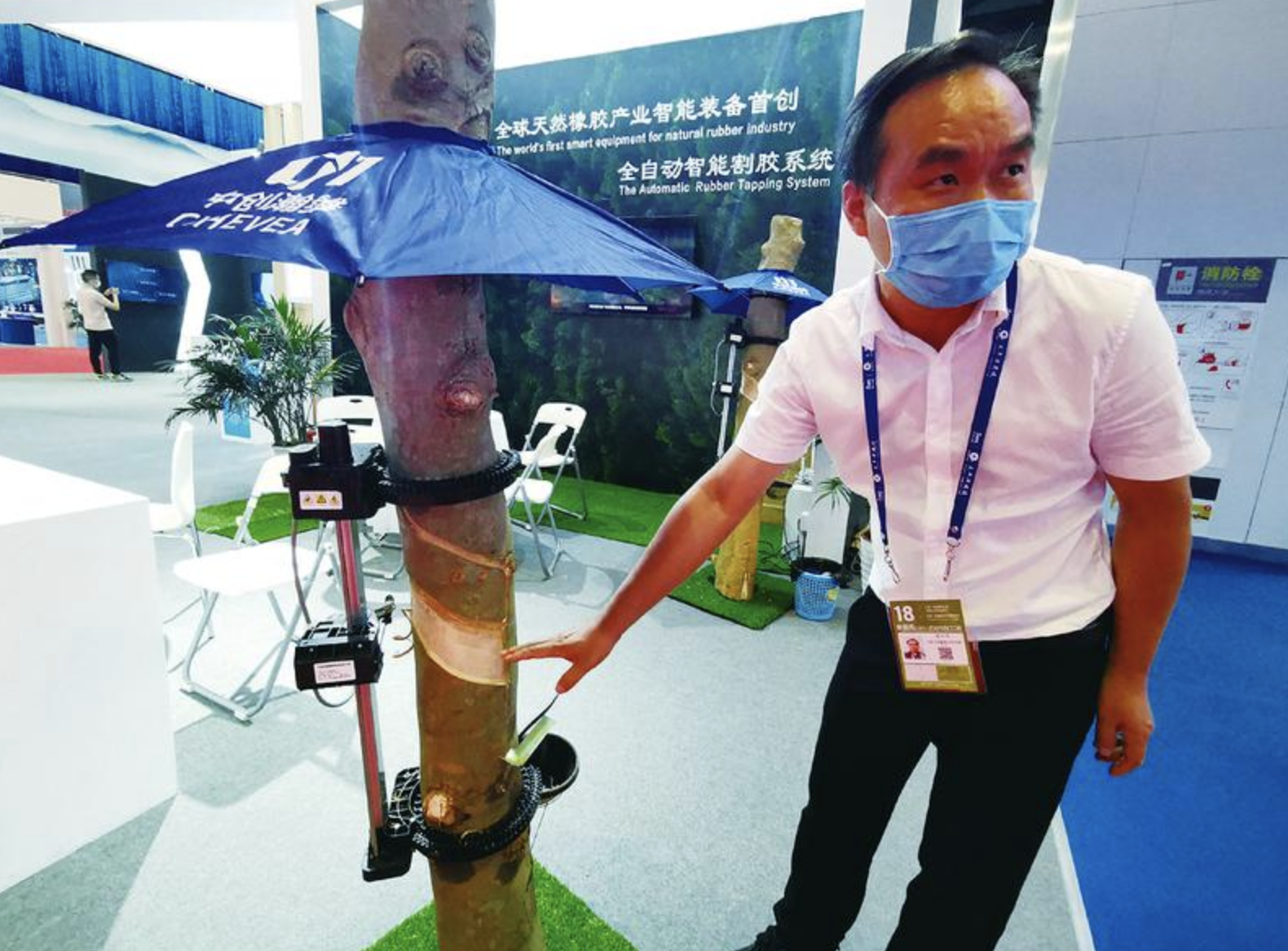泰国、越南、印尼等东盟国家是天然橡胶生产大国,张兴明表示,他们这是第一次参加东博会,希望借助东博会这个大平台,将全自动智能割胶系统向东盟国家推广。