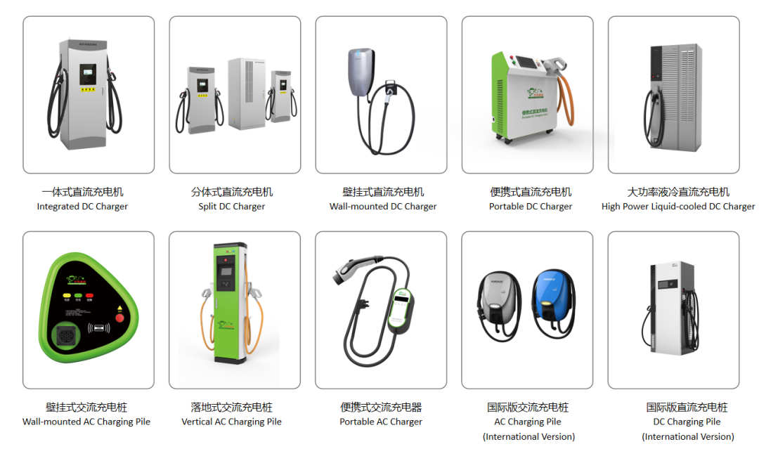 其中,直流充电机系列产品有一体式直流充电机、分体式直流充电机、便携式直流充电机、大功率液冷直流充电机;交流充电桩系列产品有壁挂式交流充电桩、落地式交流充电桩、便携式交流充电器。