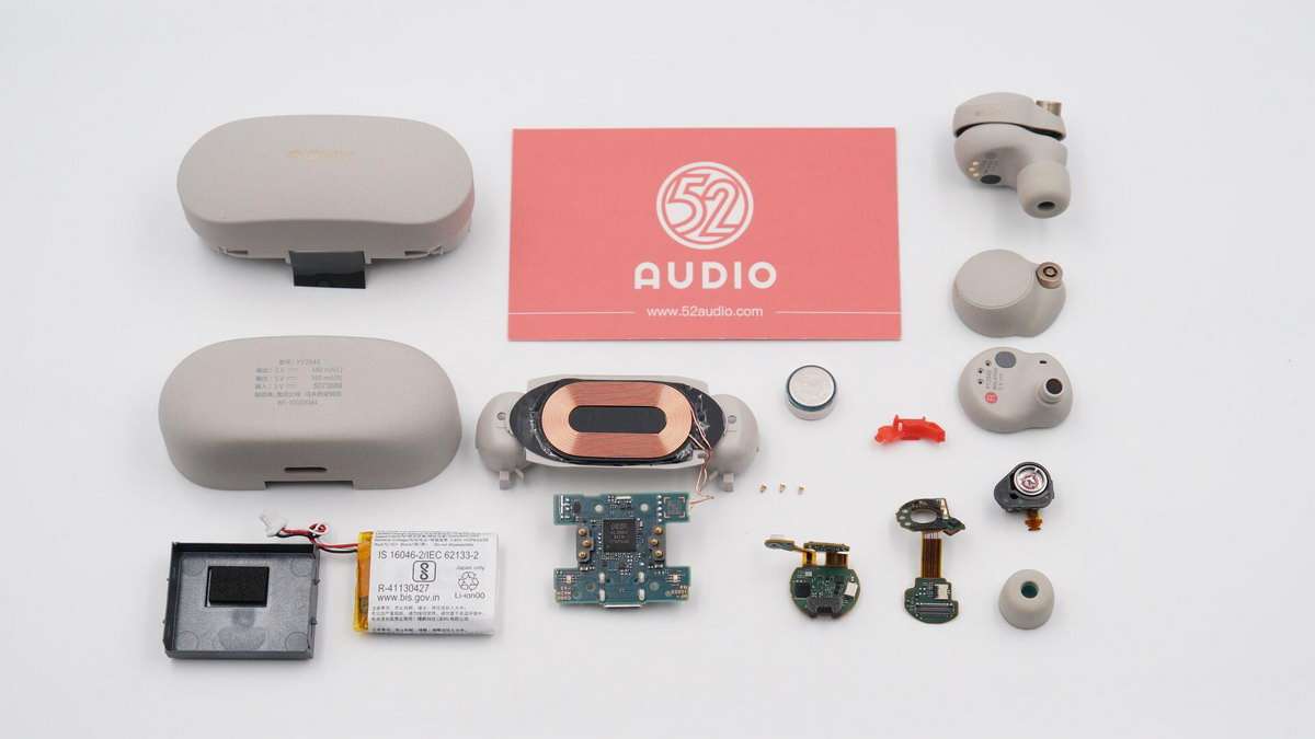 耳机内部,采用重庆紫建41mAh软包扣式电池,10mm动圈单元和3颗MEMS麦克风;内置双路入耳检测传感器,采用触控传感器和LDS镭射天线。主控为恒玄BES2500YP蓝牙音频SoC,支持蓝牙5.2,自适应ANC主动降噪功能;充电芯片为思远半导体SY8602,触控和入耳检测由汇顶科技GH611电容式入耳检测及触控2合1芯片负责。