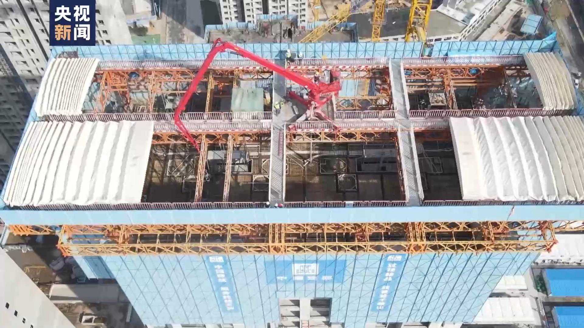 在摩天大楼的建设中,造楼机就仿佛是一间高效运转的封闭式工厂,工人可以在里面进行流水化作业,钢筋捆扎、模版安拆、混凝土浇筑等多项工序穿插施工,3—4天可完成一个结构层施工。
