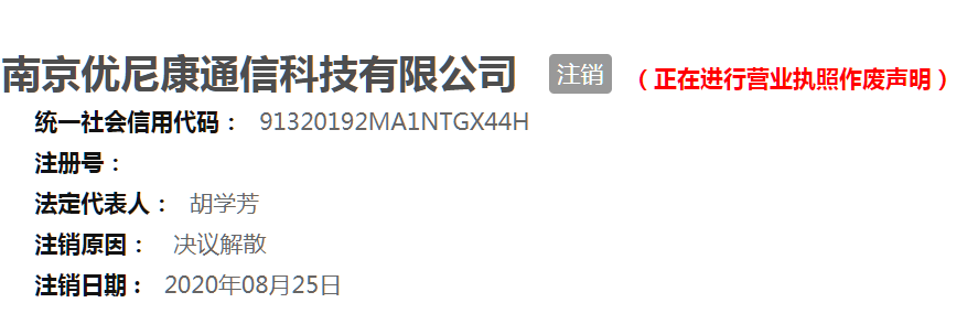 记者注意到,终止合作后,优尼康已于2020年8月注销,不再开展实际经营活动。
