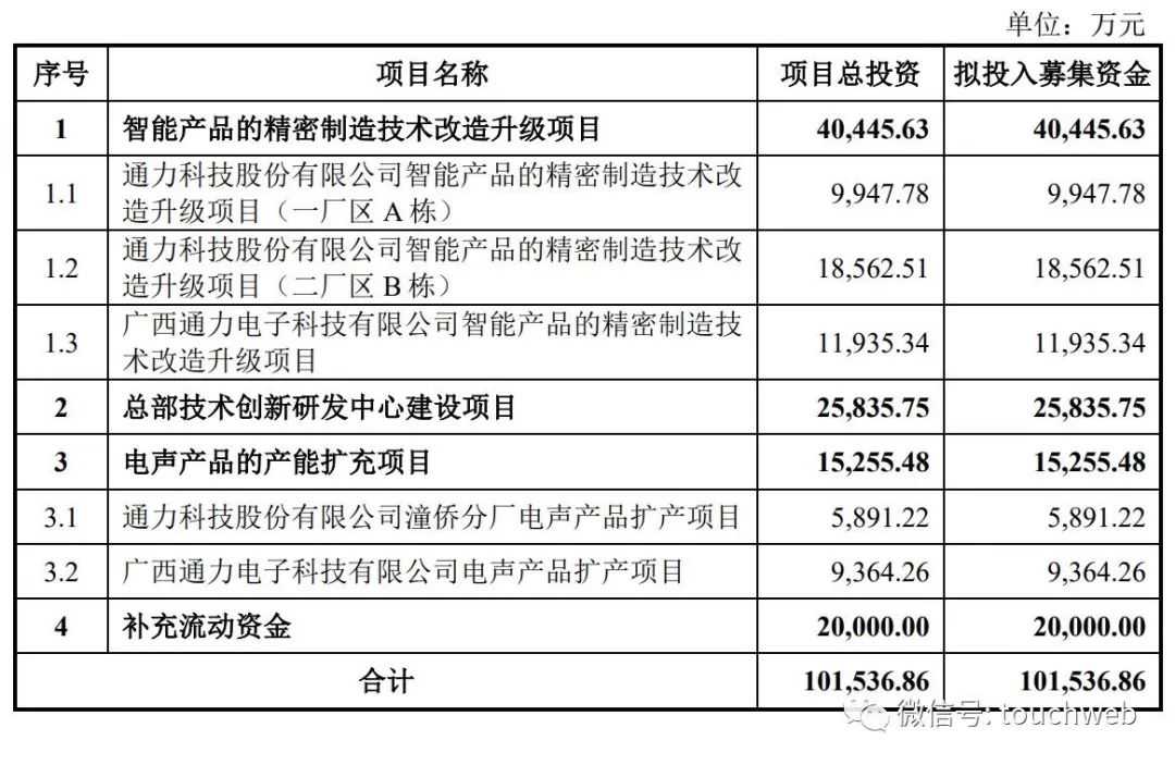 通力股份计划募资10.1537亿元,其中,4亿元用于智能产品的精密制造技术改造升级项目,2.58亿元用于总部技术创新研发中心建设项目,1.53亿元用于电声产品的产能扩充项目,2亿元用于补充流动资金。