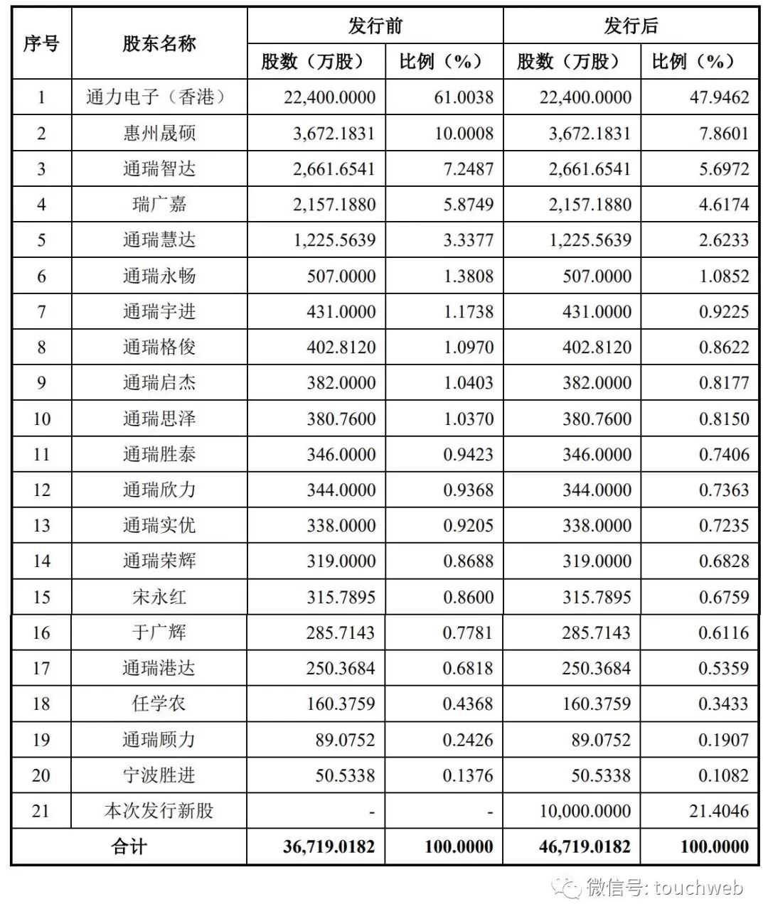 IPO后,通力电子(香港)持股为47.9462%,惠州晟硕持股为7.8601%,通瑞智达持股为5.6972%,瑞广嘉持股为4.6174%,通瑞慧达持股为2.6233%,通瑞永畅持股为1.0852%,通瑞宇进持股为0.9225%,通瑞格俊持股为0.8622%;
