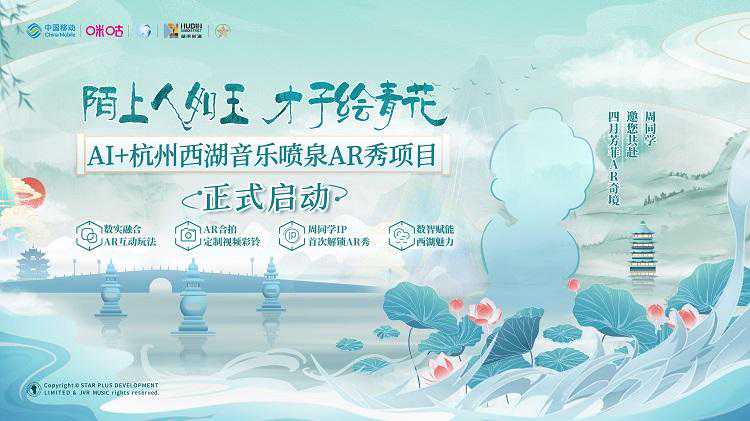 论坛现场,中国移动咪咕公司携手中国移动浙江公司、杭州市上城区湖滨街道、杭州市西湖水域管理处、巨星传奇集团有限公司共同启动“陌上人如玉,才子绘青花”AI+杭州西湖音乐喷泉AR秀项目,多方将创新聚合“杭州西湖”与“周同学”双重IP流量价值,以AI+AR技术优势赋能新质生产力,以新质内容助力杭州西湖文旅数智升级,推动文娱旅游行业打造新的消费增长点。