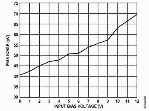图5显示了仅将输入偏置电压施加于信号链输入端时均方根噪声如何变化。每次改变输入偏置时,DAC都会将输入调整至正确电平,确保失调误差很低。信号链的均方根噪声随直流偏置的增加而增加,因为提供直流偏置的直流校准器在较高电压输出电平下会产生更多噪声。