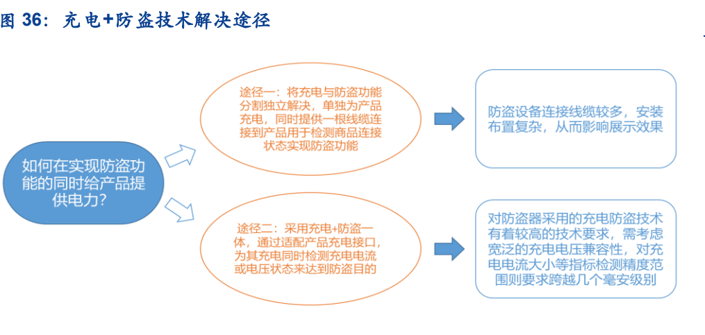防盗展示产品在对电子设备进行展示防盗的同时还需考虑为其提供充电功能,以充分保障消费电子产品的功能展示,为消费者提供更好的体验服务。消费电子产品品类日益丰富,不同产品之间因其功能用途差异,对充电要求各不相同,主要表现为充电电流大小以及充电电压的不同。如何在实现防盗功能的同时给产品提供电力是目前所有行业参与者必须面对和解决的问题,目前行业大致有两种解决途径。