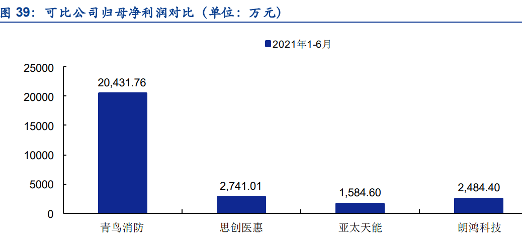 从归母净利润角度来看,2021年1-6月朗鸿科技归母净利润为2484.4万元,与思创医惠规模相近。可比公司之中,青鸟消防的归母净利润规模最大,为20431.76万元。