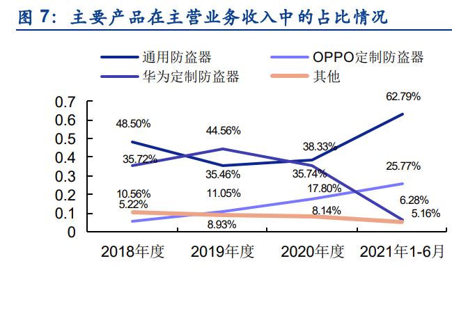2018年度至2021年6月期间,公司主营业务收入包括各类防盗器产品、配件等收入。防盗器产品是公司最主要的产品,在主营业务收入中各期占比分别为89.44%、91.07%、91.86%和94.84%,整体呈增长趋势。防盗器产品包括通用防盗器、OPPO定制防盗器、华为定制防盗器,其他部分在公司产品结构中占比较小。