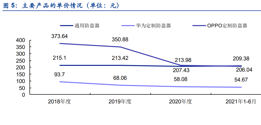 从产品平均单价角度来看,2018年至2021年6月期间,通用防盗器的单价先下降后回升,总体相对稳定,一直保持在210元/件左右的水平;华为定制防盗器的单价水平整体低于通用防盗器和OPPO定制防盗器,平均单价呈持续下降趋势,2021年1-6月降至54.67元/件;OPPO定制防盗器的平均价格持续下降,在2020年度下降幅度尤为明显,2021年1-6月的平均单价水平为206.04元/件。