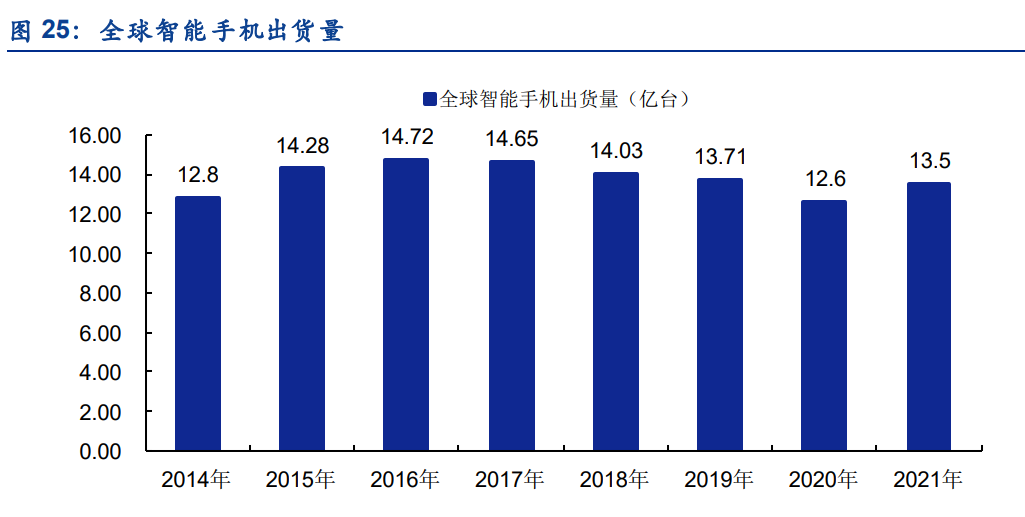 根据Canalys的报告预测,2020年全球智能手机出货量为12.6亿部,2021年全球智能手机出货量为13.5亿部,同比增长7%左右。