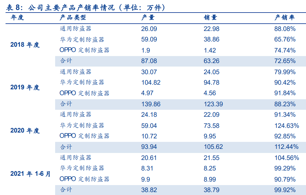 从产量角度来看,2018年至2020年,通用防盗器和华为定制防盗器的产量均呈先上升后下降的趋势,OPPO定制防盗器的产量则持续增加。2021年1-6月,通用防盗器产量达到20.61万件,OPPO定制防盗器的产量达到9.9万件,华为定制防盗器的产量却下降明显,为8.31万件。从产销率的角度来看,公司通用防盗器产销率在2018年只2021年6月期间呈持续增长趋势,华为定制防盗器和OPPO定制防盗器的产销率在2018年至2020年度持续上升,在2021年1-6月期间略有下降。公司主要产品整体的产销率也呈先上升后下降趋势。