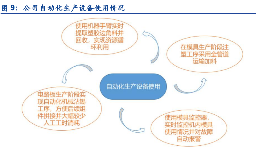 为提高生产响应速度和零部件质量,降低制造成本,公司推行纵向一体化战略,一方面不断增强自身的零部件模具开发制造能力;另一方面,结合公司自研芯片电路图设计,产品功能模块实现高度集成,电子零部件需求量下降,生产效率亦大幅提升;同时,公司逐步加大核心零部件的自产比例,目前公司已经具备了电源适配器和线材的规模化生产能力。公司的生产制造优势,一方面使公司具备了大规模生产能力,满足客户对供货数量、供货及时性和产品质量的要求;另一方面,自动化生产线和纵向一体化,提高了公司的产品竞争力与性价比,有助于公司从激烈的市场竞争中脱颖而出。