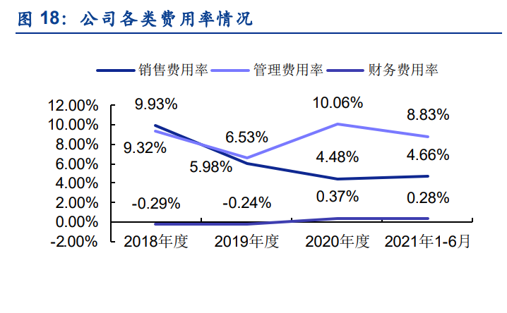 公司销售费用2018年至2021年6月总体呈下降趋势,2021年1-6月达到4.66%,主要原因系:销售人员减少及薪酬下降,2020年公司根据新收入准则将运输费由销售费用转入主营业务成本核算,车辆及差旅费、租赁费和业务招待费下降等。公司管理费用2020年出现上升,主要原因是2019年下半年富阳区新厂房完成竣工验收,公司管理人员搬迁至富阳区新厂房办公,公司2020年折旧及摊销费用较2019年增加的数额大于租赁物业费减少的数额,管理费用总体增加。公司财务费用率相对稳定。公司研发费用在2018年至2020年期间持续增加,2020年达到650.09万元。2021年1-6月公司研发费用率较之前年度略有下降,为3.12%。