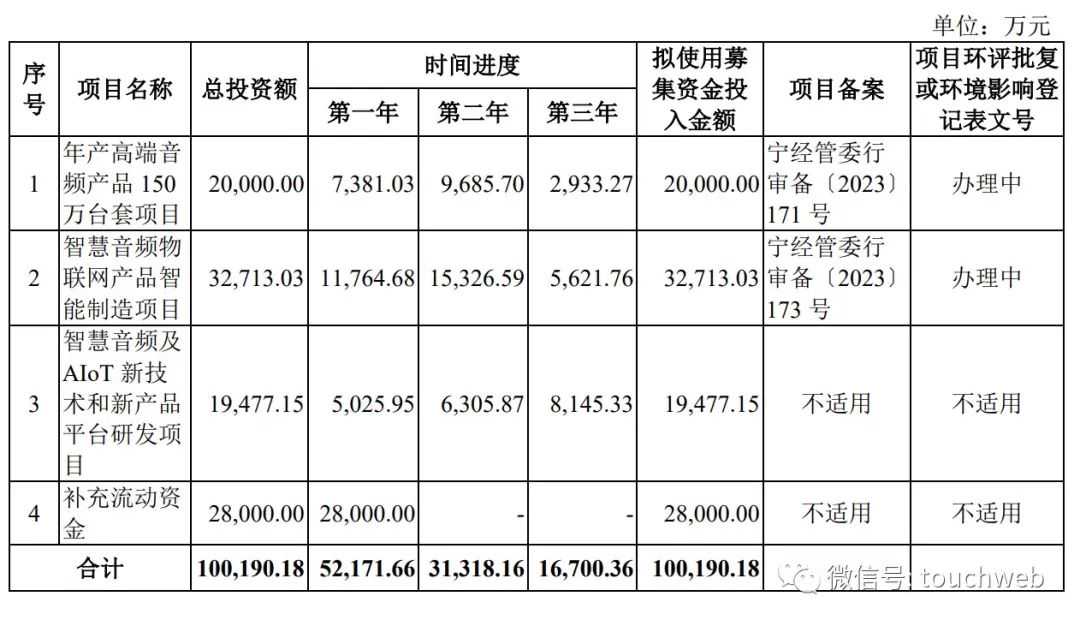 汉桑科技计划募资10亿元,其中,2亿元用于年产高端音频产品150万台套项目,3.27亿元用于智慧音频物联网产品智能制造项目,1.95亿元用于智慧音频及AIoT新技术和新产品平台研发项目,2.8亿元用于补充流动资金。