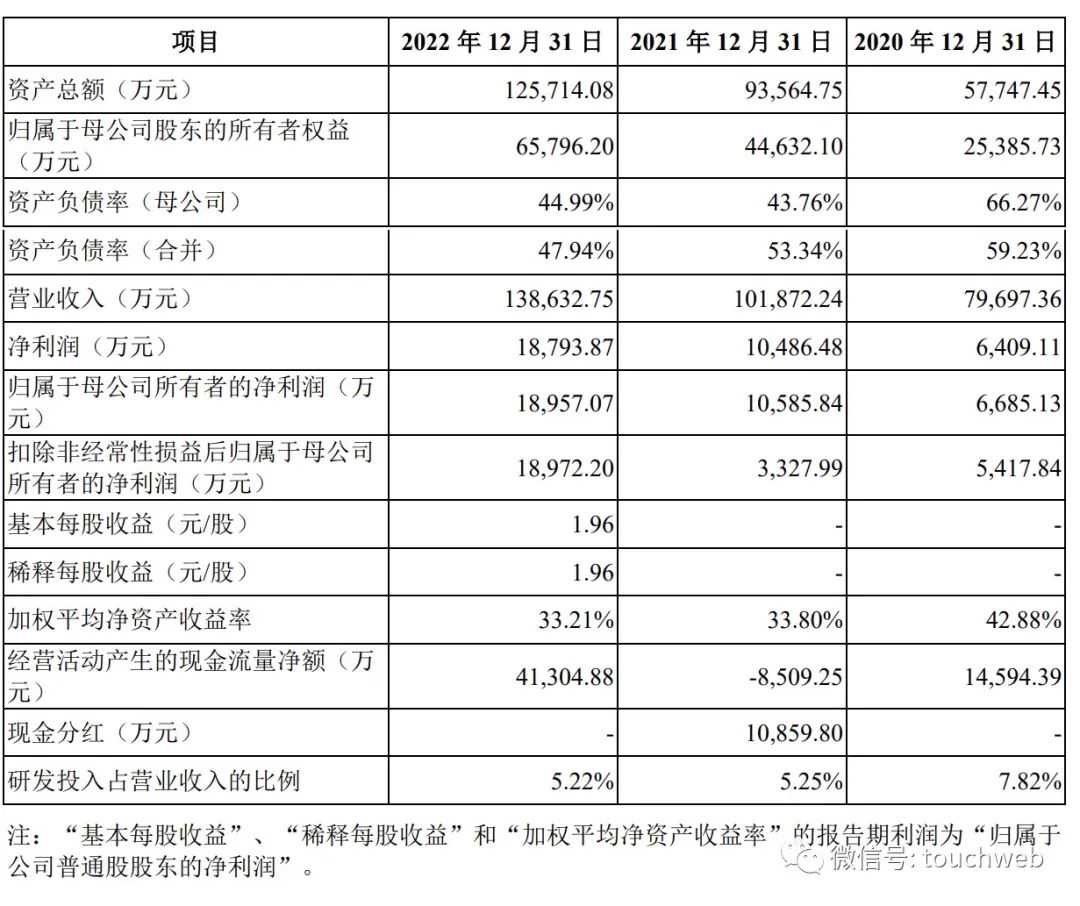 招股书显示,汉桑科技2020年、2021年、2022年营收分别为7.97亿元、10.19亿元、13.86亿元;净利分别为6409万元、1.05亿元、1.88亿元;扣非后净利分别为5417.8万元、3328万元、1.9亿元。