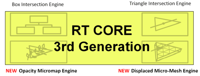 而在第三代光追核心中,还增加了两个新的引擎:OpacityMicro-MapEngines(OMM)和DisplacedMicro-MeshEngines(DMM),这两个新的硬件单元可以极大地提升光追性能(具体原理后文详细介绍)。