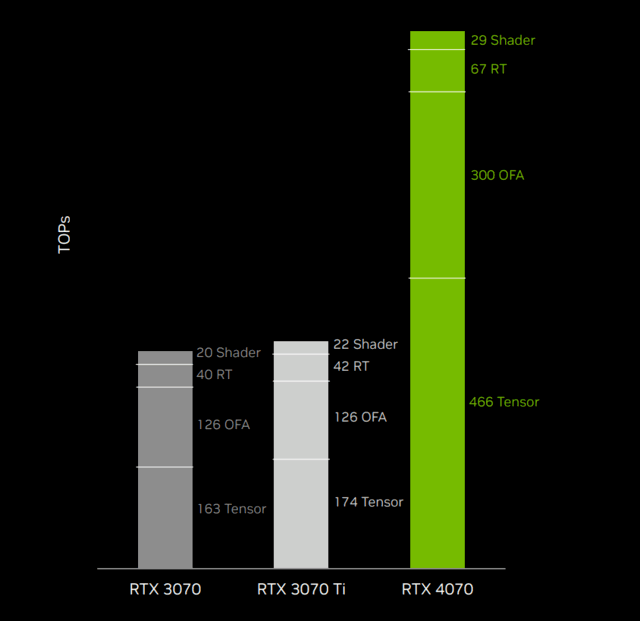 而在中端的RTX4070上也达到了惊人的466Tensor-TFLOPS,相比上一代RTX3070Ti,拥有2.7倍左右的提升。
