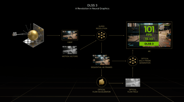 全新的DLSS3在原有的DLSS超分辨率的基础上,添加了光学多帧生成技术,以生成全新的帧,而不像原来只能生成像素。