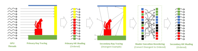 举个简单的例子,当光线第一次从发射端到碰撞端是非常有规律的射线,而碰撞到物体后的二次光追,则会出现大量发散的、无规律的反射,这对于光追负载是非常高的。而从图中便能看到,SER可以将这些指令进行二次排序,以发挥出着色器的最大性能。