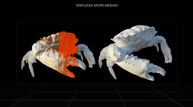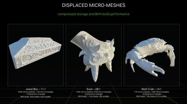 DisplacedMicro-MeshEngines可理解为微网格置换引擎,它构建光线追踪的BVH(Boundingvolumehierarchy)的速度提高了10倍!所使用的的显存减少了20倍!