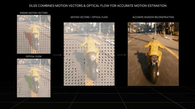 光流加速器在原本DLSS2的基础上,还可以计算两个连续帧内的光流场,能够捕捉游戏画面从第1帧到第2帧的方向和速度,从中捕捉粒子、反射和光照等像素信息。并分别计算运动矢量和光流来获得精准的阴影重建效果。