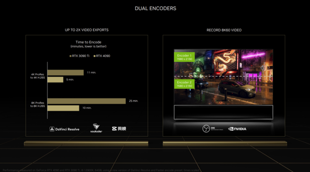 另外再说一下NVIDIA一直强调的在RTX4070Ti及以上型号配置的双AV1编码。顾名思义,即部分显卡内搭载了两个编码器,它所带来的效果也是显而易见的。