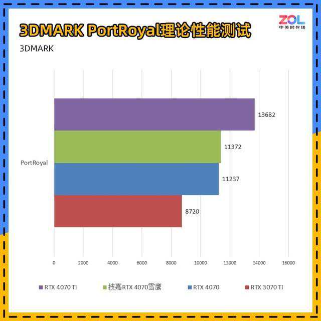PortRoyal是3DMARK中专门针对光追性能的测试项,技嘉RTX4070雪鹰相较RTX3070Ti的提升约为30%。