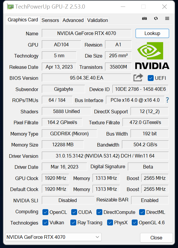 下面看一下最新版的GPU-Z信息,RTX4070采用AD104核心,拥有5888个CUDA,而此前测试的RTX4070Ti为7680个CUDA,在同系列显卡中,CUDA数量其实比较能反应性能强弱,所以简单算一下RTX4070的性能大概相当于RTX4070Ti的77%。