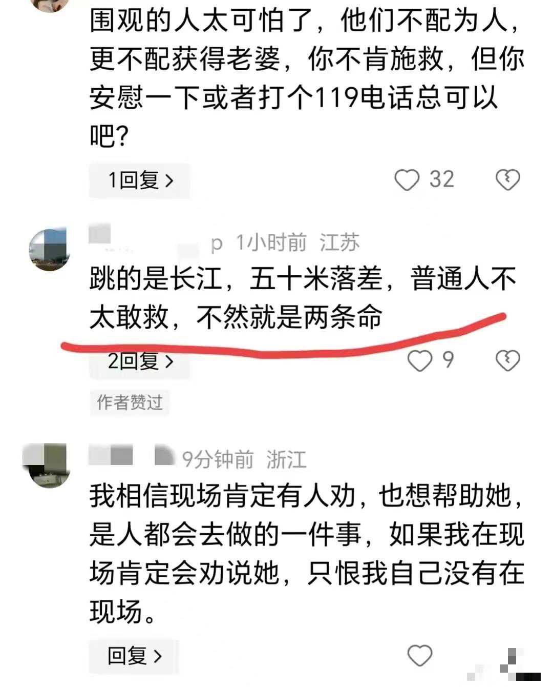 若是没有人发现,或是大家都像江苏那样当旁观者,女孩可能就真的失去性命了,她跳的很坚定决绝,显然是抱着必死的心态的。