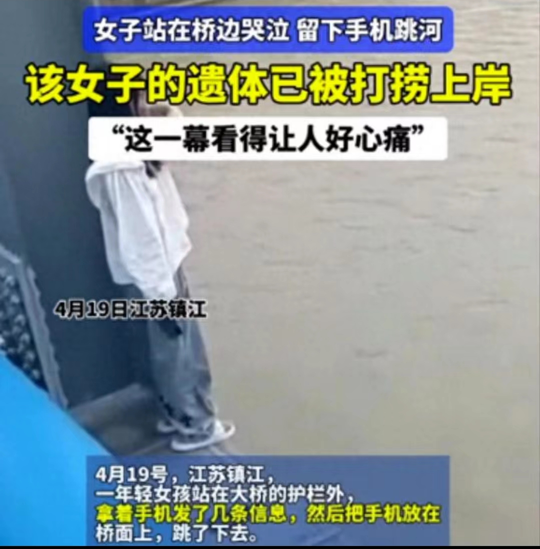 江苏女孩跳河4月19日,江苏镇江人民大桥上站着一个绝望的女孩,女孩身穿白色衣服和牛仔裤,看起来很年轻。