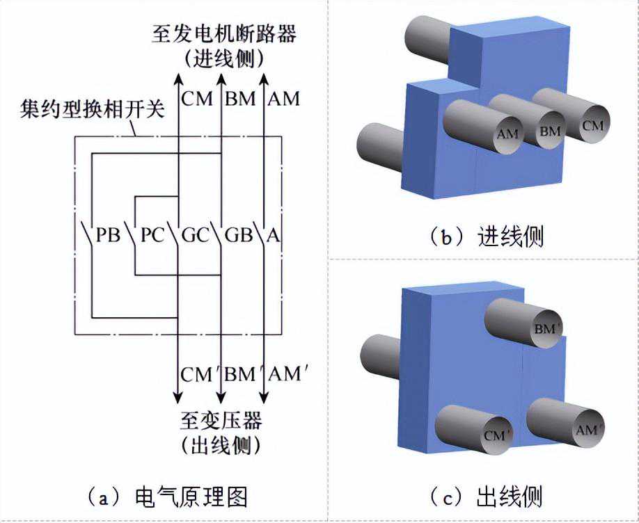 换相开关用于改变发电电动机出口三相母线的相序,可以使用两组三相开关实现该功能,即三相六极。当发电电动机处于发电工况时,机组出口母线连接一组三相开关,当发电电动机处于电动工况时,机组出口母线连接另一组三相开关。两组三相开关一端均连接至发电电动机,另一端均连接至电网。